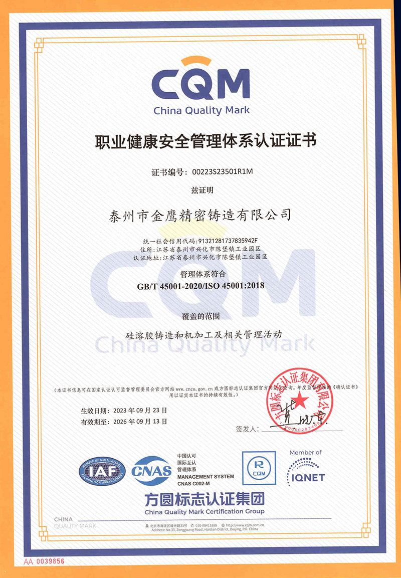 泰州金鹰-职业健康安全管理体系证书